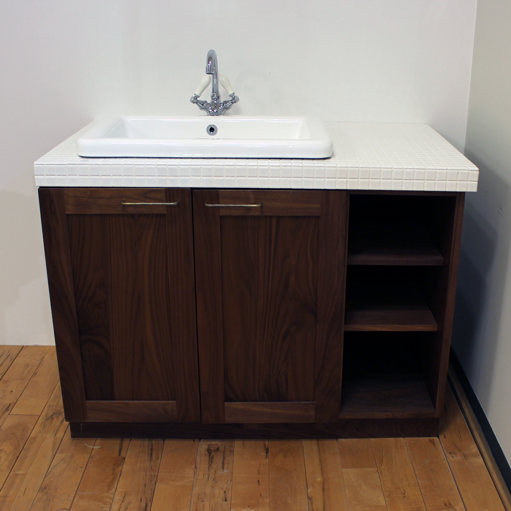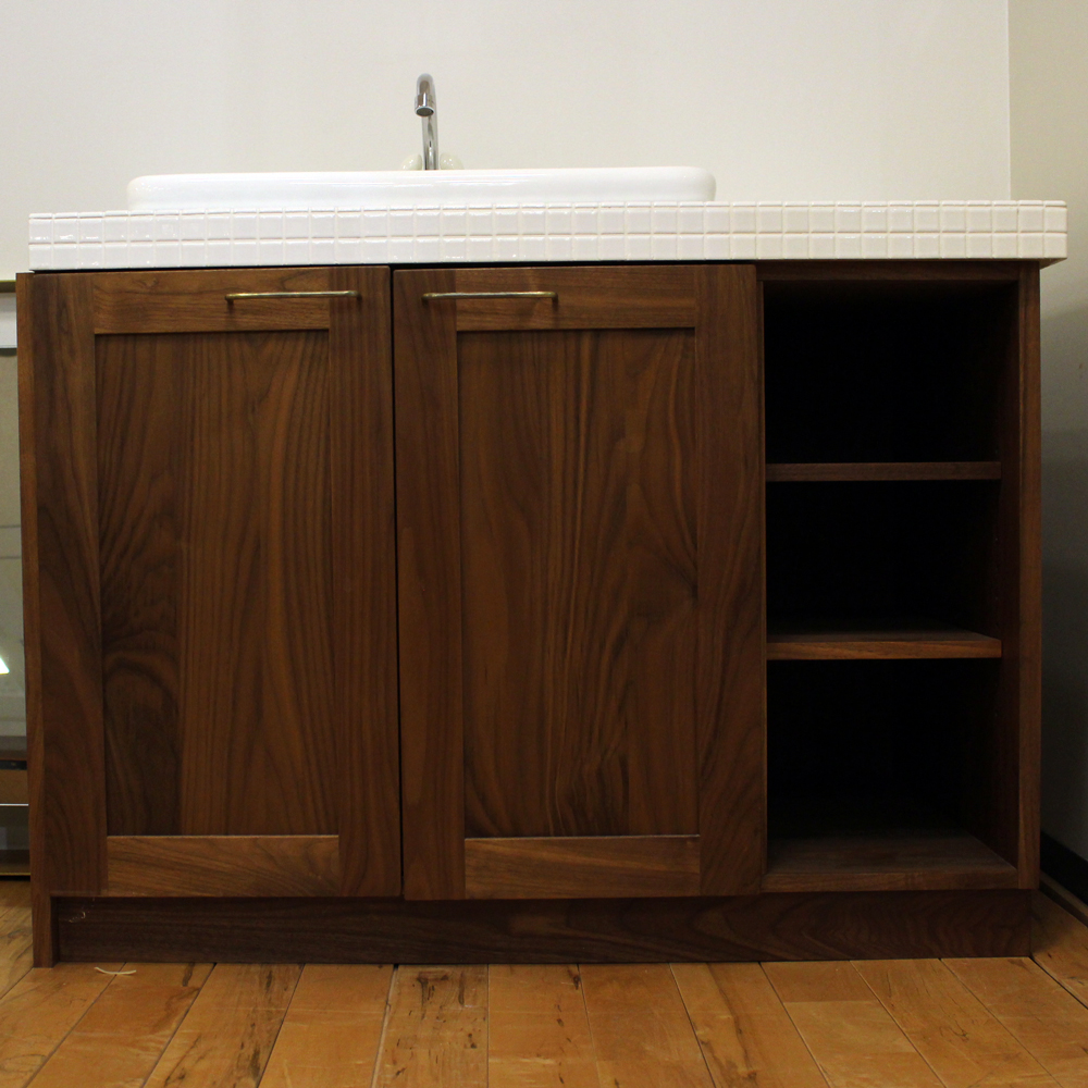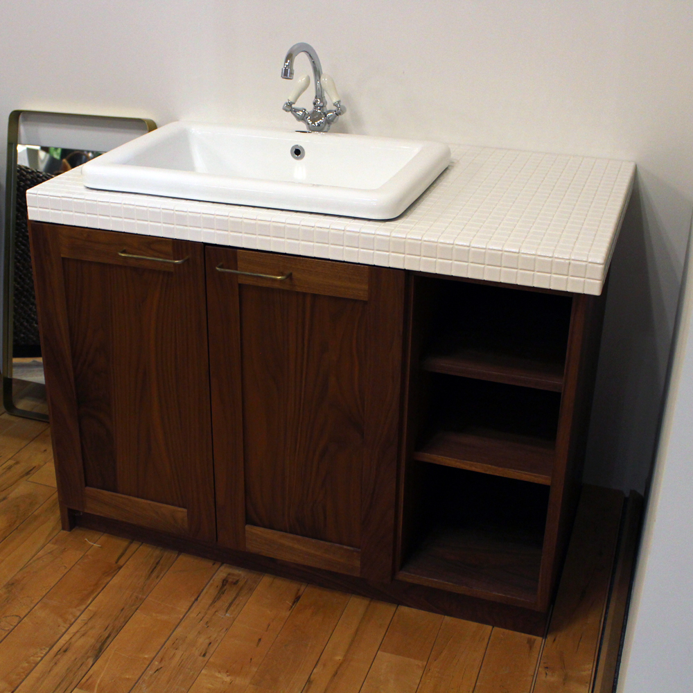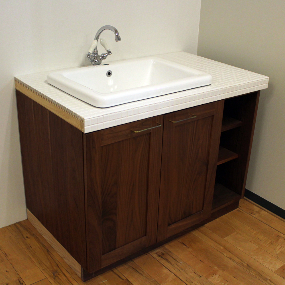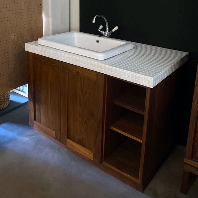 ウォールナット無垢材の温もりに、白いタイル天板の軽やかさを掛け合わせたオーダー洗面台です。