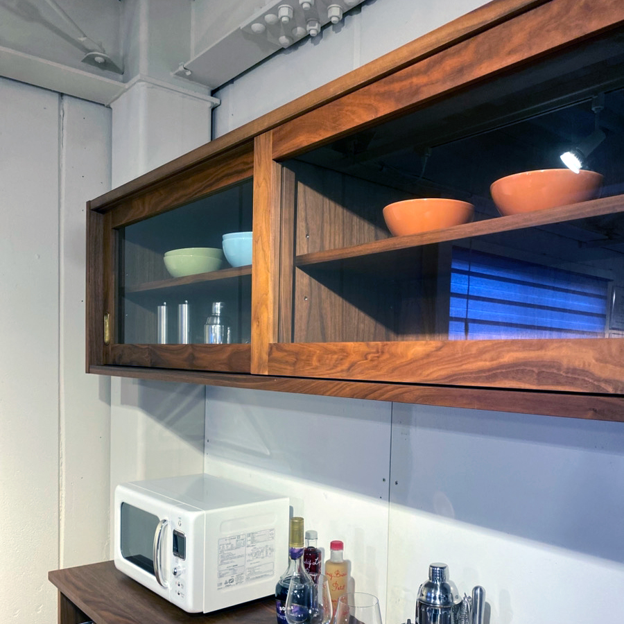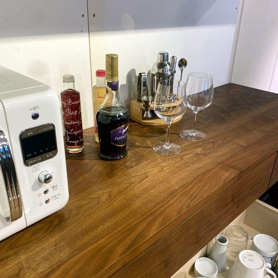 上部にはガラス扉の収納を設け、器やグラスなど、お気に入りのものは“見せる収納”として楽しめます。