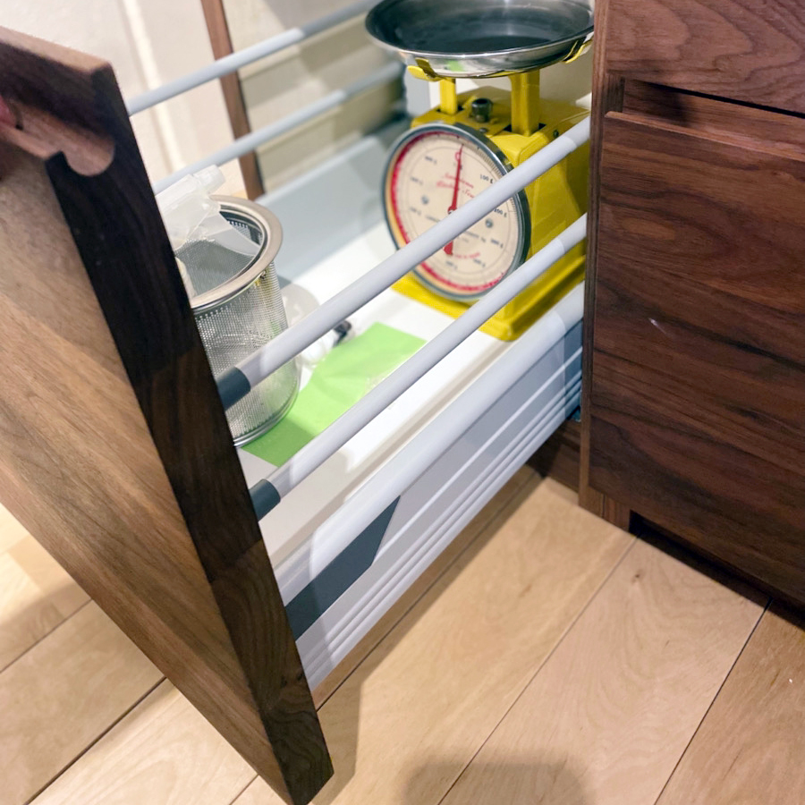 だからこそ私たちは、扉や引き出しの前板といった傷の生きやすい部分にこそ、無垢材を使いました。