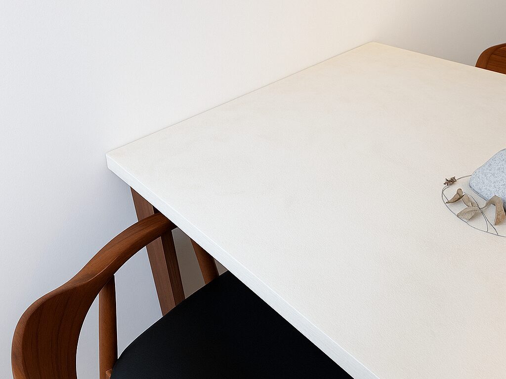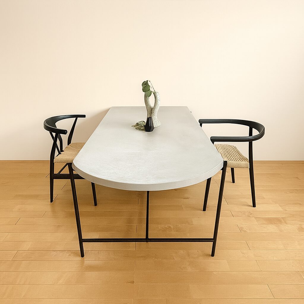 ハーフオーバル型のダイニングテーブルは、まだ一般的に普及していない珍しいフォルムであるがゆえに、インテリアの中で強い個性を放ちます。長方形や円形といった定番の形とは一線を画し、置くだけで空間に程よいアクセントを加えてくれる存在です。直線と曲線が組み合わさった独特のデザインは、シンプルでありながらも視線を引きつけ、日常の中にさりげないデザイン性を演出してくれます。