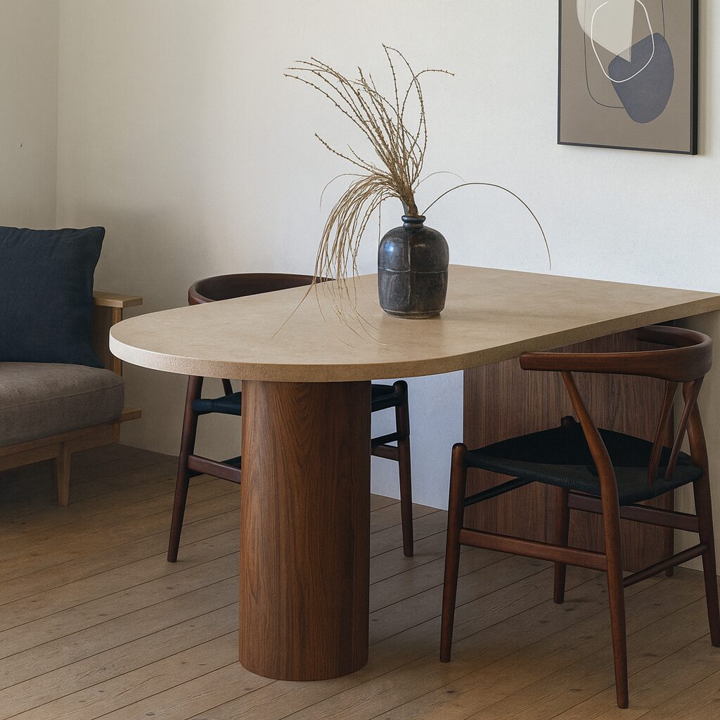 一方、楕円の曲線側は、やわらかいフォルムが自然と人を囲み込み、親しみやすい雰囲気を演出します。家族や友人と座れば、視線が交わりやすく、会話が自然と生まれる場に。食卓を中心に団らんが広がり、コミュニケーションの時間をより豊かにしてくれます。直線と曲線、二つの性質がひとつのテーブルに共存することで、暮らしのさまざまなシーンに応じた“顔”を見せてくれるのです。