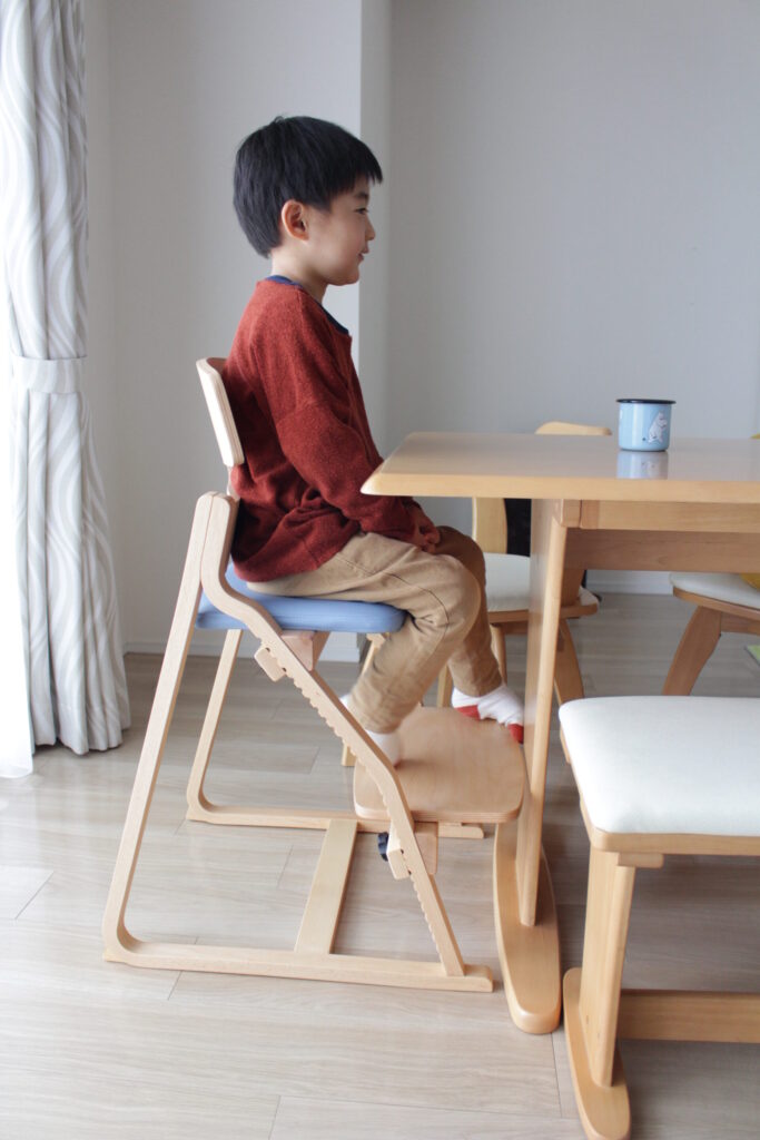 アップライトチェアは、背もたれや座面、足置きの位置まで細かく設計され、子どもが無理をしなくても自然と背筋が伸び、正しい姿勢で座れるよう導いてくれます。