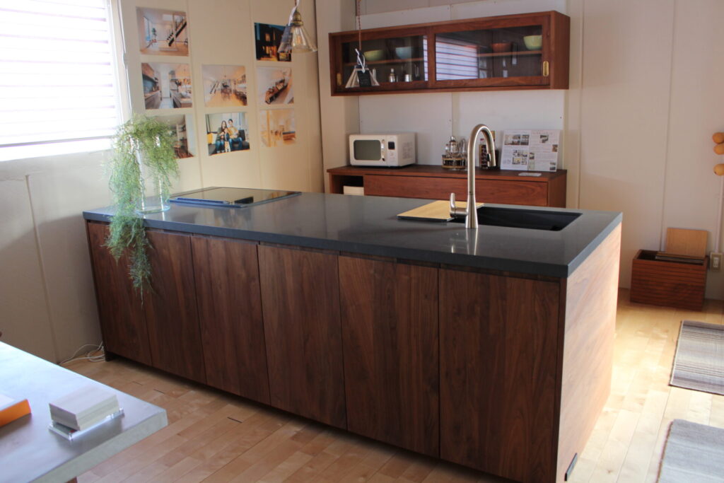 オーク材と天板のブラックの対比がカッコいいキッチン。