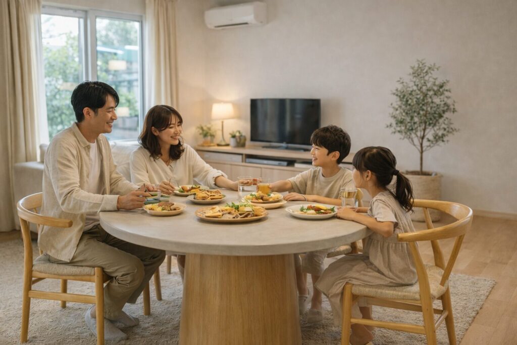 丸型ダイニングテーブルの最大の魅力は、人と人との距離が自然と近づくことにあります。