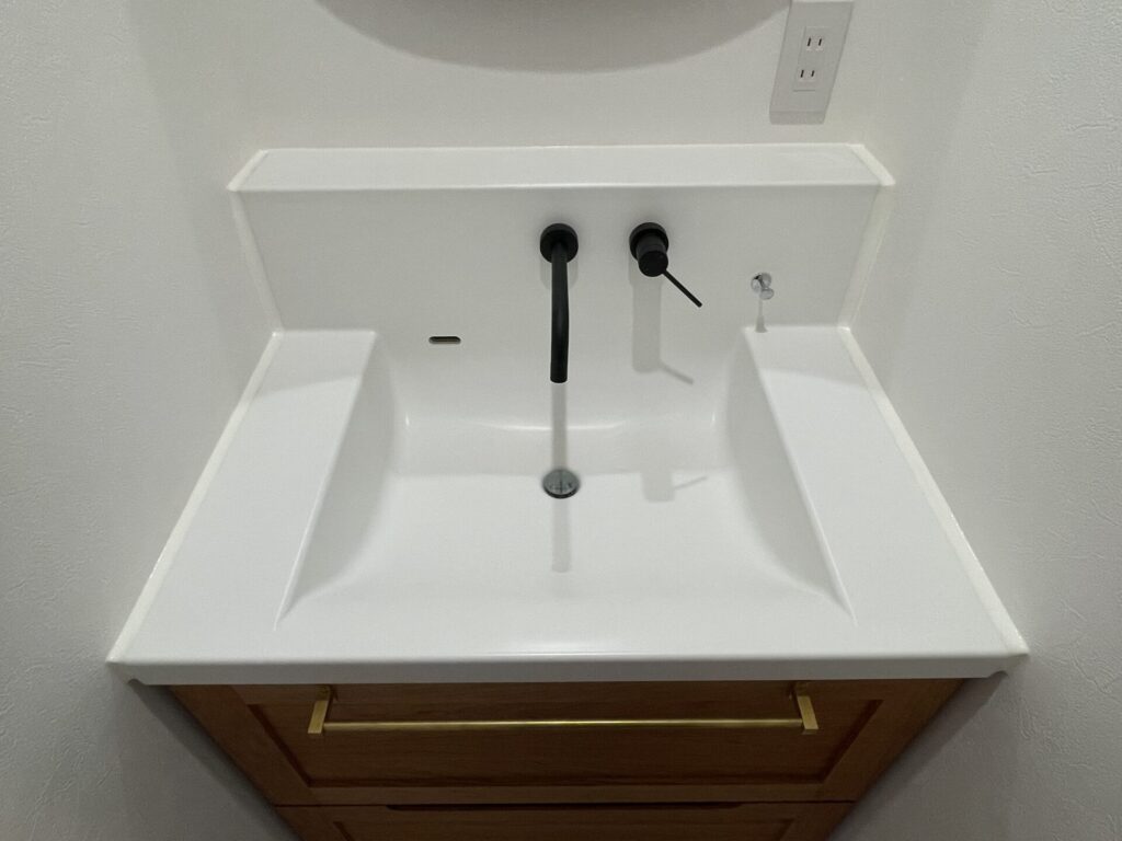 本体は無垢のブラックチェリー材オイル仕上げで、天板は洗面ボウル一体型の人工大理石を採用しており、継ぎ目のないフラットな形状が特徴。