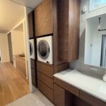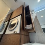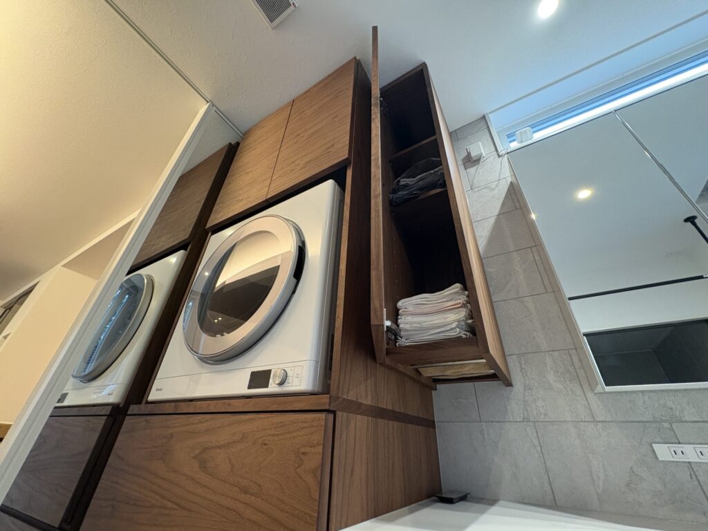 京都市H様邸にてお取付けした天然木製洗面台とガス衣類乾燥機の乾太くん用の置台収納。
