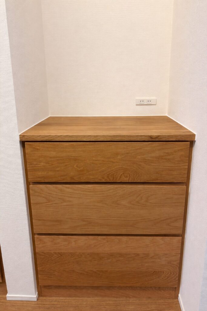 京都市H様邸にてお取付けした天然木製のキャビネット。引出し仕様で奥行もゆったりと確保しているため、日用品からストック品までしっかり収まる大容量の収納力が魅力です。
