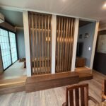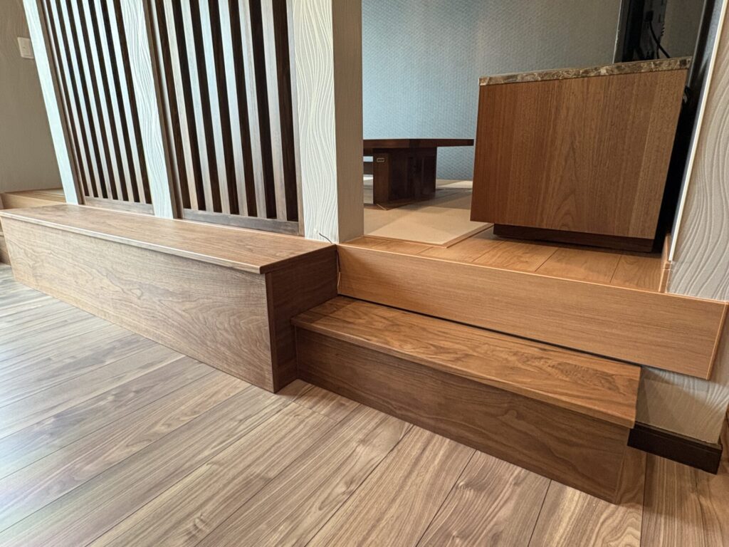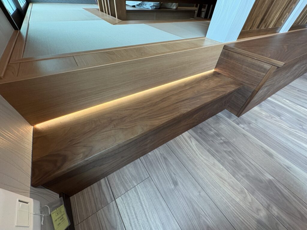 和室への段差部分にはウォールナット材のステップ台を設置し、中央には同じくウォールナット材で製作したベンチをお取付けしました。