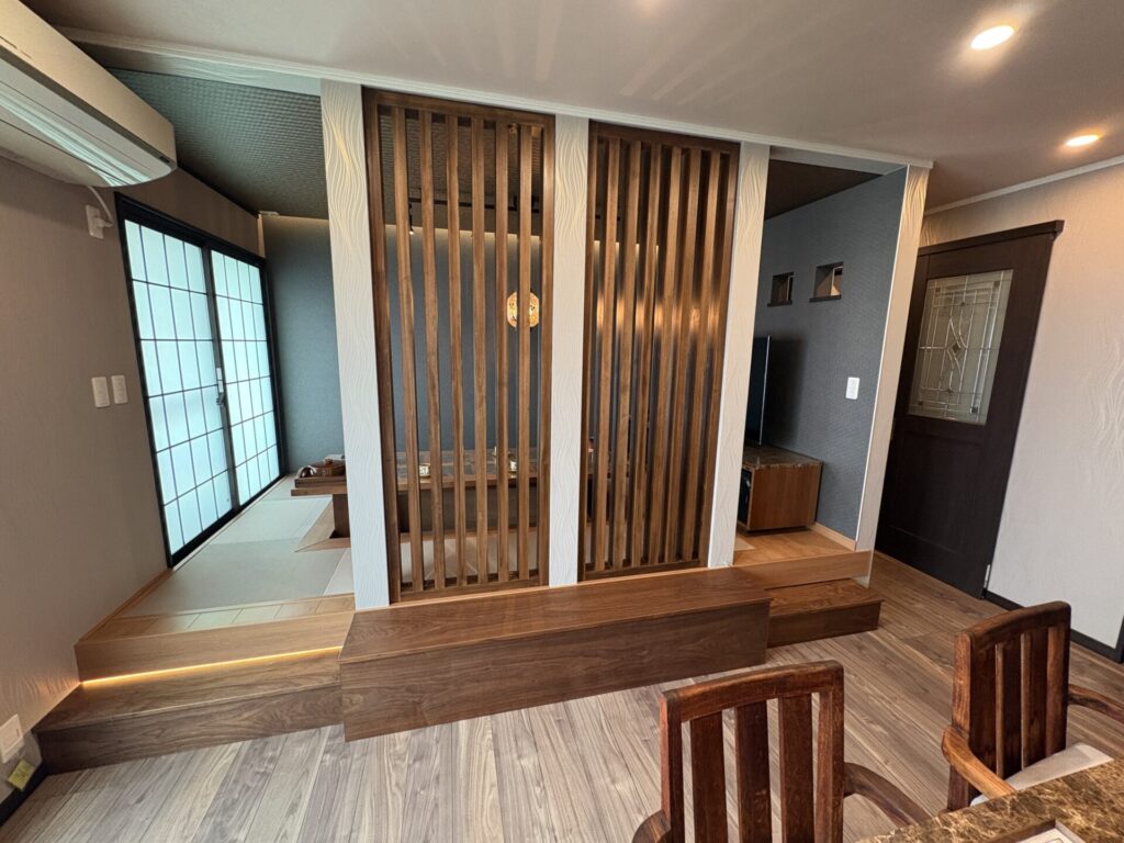 ウォールナット材ならではの落ち着いた色合いと美しい木目が、空間に上質な雰囲気をもたらし、和室とも美しく調和しています。